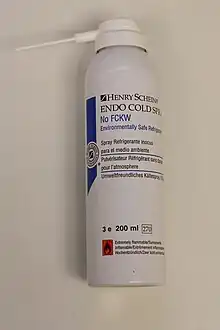 Freeze spray (cold spray or vapocoolant) is a type of aerosol spray product containing a liquified gas used for rapidly cooling surfaces, in medical and industrial applications. It is usually sold in hand-held spray cans. It may consist of various substances, which produce different temperatures, depending on the application.
