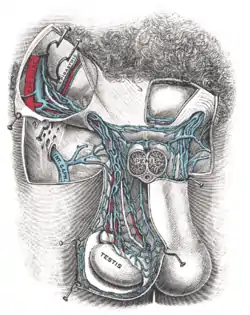A varicocele is an abnormal enlargement of the pampiniform venous plexus in the male scrotum; the female equivalent of painful swelling to the embryologically identical pampiniform venous plexus is called pelvic compression syndrome. This plexus of veins drains blood from the testicles back to the heart. The vessels originate in the abdomen and course down through the inguinal canal as part of the spermatic cord on their way to the testis. Varicoceles occur in around 15% to 20% of all men.[3][4] The incidence of varicocele increase with age.