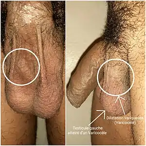 | Varicocele on the person's left testicle. Notice the swelling and slight enlargement of the left testicle, which is marked by an arrow. | |
