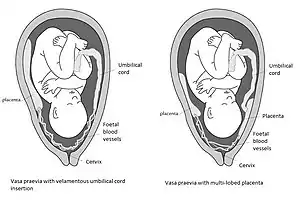 Vasa previa is seen more commonly with velamentous insertion of the umbilical cord, accessory placental lobes (succenturiate or bilobate placenta), multiple gestation, and in vitro fertilisation pregnancy. In IVF pregnancies, incidence as high as one in 300 has been reported. The reasons for this association are not clear, but disturbed orientation of the blastocyst at implantation, vanishing embryos and the increased frequency of placental morphological variations in IVF pregnancies have all been postulated.