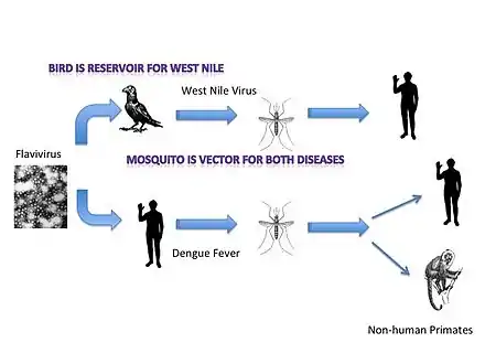 Figure 1. This figure shows how the Flavivirus is carried by mosquitos in the West Nile virus and Dengue fever. The mosquito would be considered a disease vector.