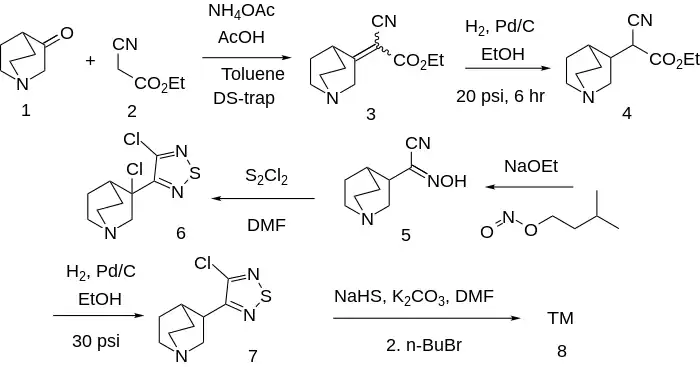 Ex 1: The Knoevenagel condensation between 3-Quinuclidone [3731-38-2] (1) & ethyl cyanoacetate [105-56-6] (2) gives Ethyl (1-azabicyclo[2.2.2]octan-3-ylidine)cyanoacetate, CID:54445383 (3). The catalytic hydrogenation of the olefin group gave Ethyl (1-azabicyclo[2.2.2]octan-3-yl)cyanoacetate [141593-50-2] (4). The reaction with sodium in ethanol, followed by addition of isoamylnitrite [110-46-3] led to (1-Azabicyclo[2.2.2]octan-3-yl)hydroxyiminoacetonitrile, CID:73192825 (5). Halogenation with Disulfur dichloride [10025-67-9] in DMF gave 3-(3-Chloroquinuclidine-3-yl)-4-chloro-1,2,5-thiadiazole, CID:9795252 (6).