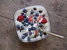 Butter and margarine can be replaced with alternate vegan products.[177] Vegan cheeses are made from seeds, such as sesame and sunflower; nuts, such as cashew,[178] pine nut, and almond;[179] and soybeans, coconut oil, nutritional yeast, tapioca,[180] and rice, among other ingredients; and can replicate the meltability of dairy cheese.[181] Nutritional yeast is a common substitute for the taste of cheese in vegan recipes.[177] Cheese substitutes can be made at home, including from nuts, such as cashews.[178] Yoghurt and cream products can be replaced with plant-based products such as soy yoghurt.[182][183]