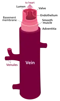 There are three sizes of vein, large, medium, and small. Smaller veins are called venules. The smallest veins are the post-capillary venules. Veins have a similar three-layered structure to arteries. The layers known as tunicas have a concentric arrangement that forms the wall of the vessel. The outer layer, is a thick layer of connective tissue called the tunica externa or adventitia; this layer is absent in the post-capillary venules.[4] The middle layer, consists of bands of smooth muscle and is known as the tunica media. The inner layer, is a thin lining of endothelium known as the tunica intima. The tunica media in the veins is much thinner than that in the arteries as the veins are not subject to the high systolic pressures that the arteries are. There are valves present in many veins that maintain unidirectional flow.