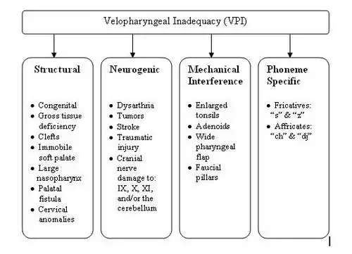Velopharyngeal inadequacy is a malfunction of a velopharyngeal mechanism which is responsible for directing the transmission of sound energy and air pressure in both the oral cavity and the nasal cavity. When this mechanism is impaired in some way, the valve does not fully close, and a condition known as 'velopharyngeal inadequacy' can develop. VPI can either be congenital or acquired later in life.