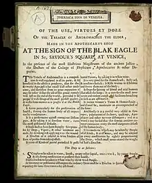 Uses and dosing instructions in an advertisement for Venice Treacle, (c. 18th century)