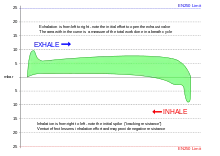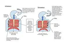 The lungs are not capable of inflating themselves, and will expand only when there is an increase in the volume of the thoracic cavity.[5][6] In humans, as in the other mammals, this is achieved primarily through the contraction of the diaphragm, but also by the contraction of the intercostal muscles which pull the rib cage upwards and outwards as shown in the diagrams on the right.[7] During forceful inhalation (Figure on the right) the accessory muscles of inhalation, which connect the ribs and sternum to the cervical vertebrae and base of the skull, in many cases through an intermediary attachment to the clavicles, exaggerate the pump handle and bucket handle movements (see illustrations on the left), bringing about a greater change in the volume of the chest cavity.[7] During exhalation (breathing out), at rest, all the muscles of inhalation relax, returning the chest and abdomen to a position called the "resting position", which is determined by their anatomical elasticity.[7] At this point the lungs contain the functional residual capacity of air, which, in the adult human, has a volume of about 2.5–3.0 liters.[7]