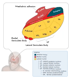 ![]() Thalamic nuclei: MNG = Midline nuclear group AN = Anterior nuclear group MD = Medial dorsal nucleus VNG = Ventral nuclear group VA = Ventral anterior nucleus VL = Ventral lateral nucleus VPL = Ventral posterolateral nucleus VPM = Ventral posteromedial nucleus LNG = Lateral nuclear group PUL = Pulvinar MTh = Metathalamus LG = Lateral geniculate nucleus MG = Medial geniculate nucleus | |