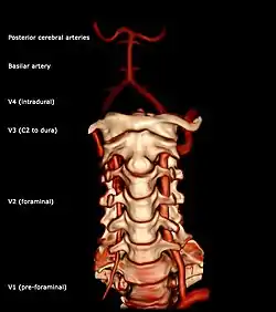 As the supplying component of the vertebrobasilar vascular system, the vertebral arteries supply blood to the upper spinal cord, brainstem, cerebellum, and posterior part of brain.[1] A stroke of the arteries may result in a posterior circulation stroke.