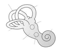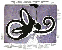 ![]() Schematic overview of the vestibulocochlear organ, vestibule centre left. | |