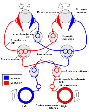 For instance, if the head is turned clockwise as seen from above, then excitatory impulses are sent from the semicircular canal on the right side via the vestibular nerve through Scarpa's ganglion and end in the right vestibular nuclei in the brainstem. From this nuclei excitatory fibres cross to the left abducens nucleus. There they project and stimulate the lateral rectus of the left eye via the abducens nerve. In addition, by the medial longitudinal fasciculus and oculomotor nuclei, they activate the medial rectus muscles on the right eye. As a result, both eyes will turn counter-clockwise.