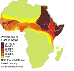 According to a UNICEF report, the top rates for FGM are in Somalia (with 98 percent of women affected), Guinea (96 percent), Djibouti (93 percent), Egypt (91 percent), Eritrea (89 percent), Mali (89 percent), Sierra Leone (88 percent), Sudan (88 percent), Gambia (76 percent), Burkina Faso (76 percent), Ethiopia (74 percent), Mauritania (69 percent), Liberia (66 percent), and Guinea-Bissau (50 percent).[137] FGM is linked to cultural rites and customs, including traditional practices. It continues to take place in different communities of Africa and the Middle East, including in places where it is banned by national legislation. According to a 2013 UNICEF report, 125 million women and girls in Africa and the Middle East have experienced FGM.[137] Due to globalization and immigration, FGM is spreading beyond the borders of Africa and Middle East, to countries such as Australia, Belgium, Canada, France, New Zealand, the U.S., and UK.[138]