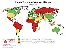 Women are more likely to be victimized by someone that they are intimate with, commonly called "intimate partner violence" (IPV). Instances of IPV tend not to be reported to police and thus many experts find it hard to estimate the true magnitude of the problem.[95] Though this form of violence is often considered as an issue within the context of heterosexual relationships, it also occurs in lesbian relationships,[96] daughter-mother relationships, roommate relationships and other domestic relationships involving two women. Violence against women in lesbian relationships is about as common as violence against women in heterosexual relationships.[97]