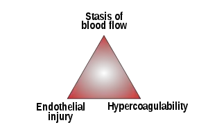 | Phenomena of interrupted blood-flow | Stasis [4] | The first category, alterations in normal blood flow, refers to several situations. These include venous stasis, long surgical operations, prolonged immobility (whilst on a long plane or car ride, bed bound during hospitalization), and varicose veins. The equivalence of Virchow's version and the modern version has been disputed.[5] |