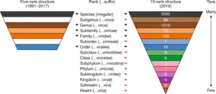 Viral classification starts at the level of realm and continues as follows, with the taxonomic suffixes in parentheses:[8]