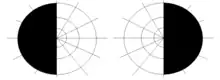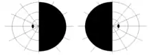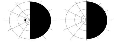 | Visual pathway lesions From top to bottom: 1. Complete loss of vision in the right eye 2. Bitemporal hemianopia 3. Homonymous hemianopia 4. Quadrantanopia 5.& 6. Quadrantanopia with macular sparing | |