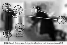 The picture to the right shows what may happen during the first two seconds of visual inspection. While the background is out of focus, representing the peripheral vision, the first eye movement goes to the boots of the man (just because they are very near the starting fixation and have a reasonable contrast). Eye movements serve the function of attentional selection, i.e., to select a fraction of all visual inputs for deeper processing by the brain.