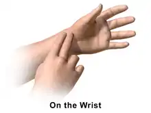 The pulse is the rate at which the heart beats while pumping blood through the arteries, recorded as beats per minute (bpm).[10] It may also be called "heart rate". In addition to providing the heart rate, the pulse should also be evaluated for strength and obvious rhythm abnormalities.[10] The pulse is commonly taken at the wrist (radial artery). Alternative sites include the elbow (brachial artery), the neck (carotid artery), behind the knee (popliteal artery), or in the foot (dorsalis pedis or posterior tibial arteries).[10] The pulse is taken with the index finger and middle finger by pushing with firm yet gentle pressure at the locations described above, and counting the beats felt per 60 seconds (or per 30 seconds and multiplying by two).[10] The pulse rate can also be measured by listening directly to the heartbeat using a stethoscope. The pulse may vary due to exercise, fitness level, disease, emotions, and medications.[10] The pulse also varies with age. A newborn can have a heart rate of 100–⁠160 bpm, an infant (0–⁠5 months old) a heart rate of 90–⁠150 bpm, and a toddler (6–⁠12 months old) a heart rate of 80–140 bpm.[11] A child aged 1–⁠3 years old can have a heart rate of 80–⁠130 bpm, a child aged 3–⁠5 years old a heart rate of 80–⁠120 bpm, an older child (age of 6–10) a heart rate of 70–⁠110 bpm, and an adolescent (age 11–⁠14) a heart rate of 60–105 bpm.[11] An adult (age 15+) can have a heart rate of 60–100 bpm.[13]