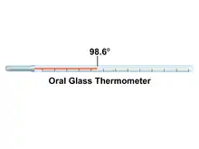 Temperature can be measured from the mouth, rectum, axilla (armpit), ear, or skin. Oral, rectal, and axillary temperature can be measured with either a glass or electronic thermometer.[10] Note that rectal temperature measures approximately 0.5 °C higher than oral temperature, and axillary temperature approximately 0.5 °C less than oral temperature.[11] Aural and skin temperature measurements require special devices designed to measure temperature from these locations.[10]