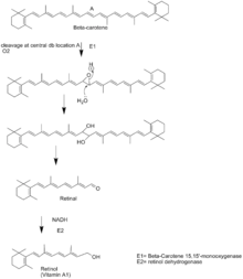 Unlike retinol, β-carotene is taken up by enterocytes by the membrane transporter protein scavenger receptor B1 (SCARB1). The protein is upregulated in times of vitamin A deficiency. If vitamin A status is in the normal range, SCARB1 is downregulated, reducing absorption.[5] Also downregulated is the enzyme beta-carotene 15,15'-dioxygenase (formerly known as beta-carotene 15,15'-monooxygenase) coded for by the BCMO1 gene, responsible for symmetrically cleaving β-carotene into retinal.[7] Absorbed β-carotene is either incorporated as such into chylomicrons or first converted to retinal and then retinol, bound to RBP2. After a meal, roughly two-thirds of the chylomicrons are taken up by the liver with the remainder delivered to peripheral tissues. Peripheral tissues also can convert chylomicron β-carotene to retinol.[5][14]