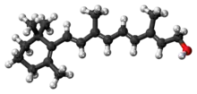 Vitamin A is a fat-soluble vitamin, a category that also includes vitamins D, E and K. The vitamin encompasses several chemically related naturally occurring compounds or metabolites, i.e., vitamers, that all contain a β-ionone ring.[3] The primary dietary form is retinol, which may have a fatty acid molecule attached, creating a retinyl ester, when stored in the liver. Retinol – the transport and storage form of vitamin A – is interconvertible with retinal, catalyzed to retinal by retinol dehydrogenases and back to retinol by retinaldehyde reductases.[10]