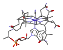 Vitamin B12, also known as cobalamin, is a water-soluble vitamin involved in metabolism.[2] It is one of eight B vitamins. It is required by animals, which use it as a cofactor in DNA synthesis, and in both fatty acid and amino acid metabolism.[3] It is important in the normal functioning of the nervous system via its role in the synthesis of myelin, and in the circulatory system in the maturation of red blood cells in the bone marrow.[2][4] Plants do not need cobalamin and carry out the reactions with enzymes that are not dependent on it.[5]