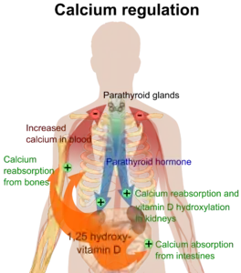 VDR activation in the intestine, bone, kidney, and parathyroid gland cells leads to the maintenance of calcium and phosphorus levels in the blood (with the assistance of parathyroid hormone and calcitonin) and to the maintenance of bone content.[1][19]