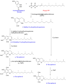 Photosynthesizing plants, algae and cyanobacteria synthesize tocochromanols, the chemical family of compounds made up of four tocopherols and four tocotrienols; in a nutrition context this family is referred to as Vitamin E. Biosynthesis starts with formation of the closed-ring part of the molecule as homogentisic acid (HGA). The side chain is attached (saturated for tocopherols, polyunsaturated for tocotrienols). The pathway for both is the same, so that gamma- is created and from that alpha-, or delta- is created and from that the beta- compounds.[29][30] Biosynthesis takes place in the plastids.[30]