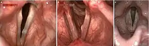 There are generally four components included in the full diagnosis of a vocal cord cyst: a medical and voice history, a head and neck exam, a perceptual assessment of the voice and imaging of the vocal folds.[11] A medical and voice history can help distinguish patterns of misuse and phonotrauma to assist in diagnosis.[3] The primary perceptual sign of vocal fold cysts is hoarseness of the voice.[3] Diagnosis through perceptual means alone is difficult, therefore in the fourth component of diagnosis the patient often undergoes an imaging procedure.[2][12] Imaging is most commonly done with laryngeal videostroboscopy.[11] A videostroboscopy is an examination of the vocal folds using flashes of light to slow down the image of the vocal fold movement enough to provide a sharp picture of the phases of the movement cycle (mucosal wave.)[13] This procedure provides information about vocal fold vibrations during speech, vocal intensity and vocal frequency.[11] Imaging shows the reduced movement of the vocal folds (mucosal wave) when a vocal fold cyst is present.[11] Further, videostroboscopy tends to show increased submucosal swelling in the affected areas of the vocal fold(s)[9] More recently, other technologies have been introduced to assist with obtaining imaging of the vocal folds, including the use of Narrow-band imaging (NBI.)[12] Narrow-band imaging involves the use of blue and yellow lights to improve the picture quality of an image and accentuate blood vessel visibility.[12] NBI has been found to help improve visual identification of vocal fold cysts in some cases.[12]