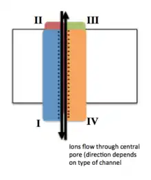 ![]() Each of the four homologous domains makes up one subunit of the ion channel. The S4 voltage-sensing segments (marked with + symbols) are shown as charged. | |