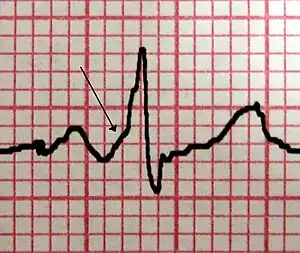 A characteristic "delta wave" (arrow) seen in a person with Wolff–Parkinson–White syndrome. Note the short PR interval.