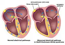 Wolff–Parkinson–White syndrome (WPWS) is a disorder due to a specific type of problem with the electrical system of the heart involving an accessory pathway able to conduct electrical current between the atria and the ventricles, thus bypassing the atrioventricular node.[2][3] About 60% of people with the electrical problem developed symptoms,[5] which may include an abnormally fast heartbeat, palpitations, shortness of breath, lightheadedness, or syncope.[1] Rarely, cardiac arrest may occur.[1] The most common type of irregular heartbeat that occurs is known as paroxysmal supraventricular tachycardia.[1]