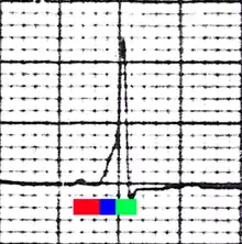 One beat from a rhythm strip in V2 demonstrating characteristic findings in Wolff–Parkinson–White syndrome. A characteristic delta wave (above the blue bar), a short PR interval (red bar) of 80 ms, and a long QRS complex (blue bar plus green bar) at 120 ms are visible.