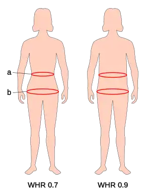 In general, adults with growth hormone deficiencies also have increased WHRs.[23][24] Adults with untreated congenital isolated growth hormone deficiency have increased WHRs, possibly from increased cortisone–cortisol ratios and insulin sensitivities.[24] Since these individuals have increased visceral obesity, it has been suggested that a minimal growth hormone secretion would theoretically increase insulin resistance.[24] However, because of the growth hormone deficiency, this insulin resistance point cannot be reached and these individuals are more sensitive to insulin. Increased adipose deposits are therefore more likely to form in these individuals, causing the high WHR. Growth hormone deficiencies have also been correlated with WHRs in prepubertal children; the specific baseline body statistics, such as WHRs, of pre-pubertal children with growth hormone deficiencies can predict growth response effectiveness to artificial growth hormone therapies, such as rhGH treatments.[25]