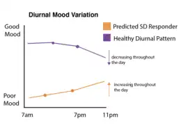 Mood fluctuations are currently thought to be dependent on circadian processes. A typical healthy individual without a mood disorder shows circadian-locked fluctuations in mood, with positive mood beginning right after the morning awakening, and decaying as the day goes on during prolonged wakefulness. A typical individual with depression will show the opposite mood fluctuation cycle, with a low mood right after morning awakening, which gradually becomes more positive with prolonged wakefulness. These circadian-locked changes across the day are referred to as "diurnal" variations in mood. Evidence across many sleep deprivation studies suggests that an individual's diurnal mood fluctuations can be used to predict whether they will respond to sleep deprivation therapy.[25] Individuals with depression who show the typical low morning mood that increases throughout the day are more likely to respond positively to sleep deprivation than individuals who show mood fluctuations that deviate from the typical pattern.[25] One caveat to these findings is that a single individual may show diurnal fluctuations that vary day-to-day, showing typical diurnal changes on one day while not showing any changes (constant mood) on the next. This complexity was addressed in studies that followed single individuals and administered repeated sleep deprivation on days when the individual showed different mood fluctuations. The studies showed that an individual's ability to show the typical mood fluctuations was a better predictor of whether they would respond to sleep deprivation treatment than the individual's mood state on the particular day that they underwent sleep deprivation.[25]