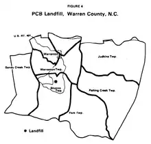Warren County PCB Landfill was a PCB landfill located in Warren County, North Carolina, near the community of Afton south of Warrenton. The landfill was created in 1982 by the State of North Carolina as a place to dump contaminated soil as result of an illegal PCB dumping incident. The site, which is about 150 acres (0.61 km2), was extremely controversial and led to years of lawsuits. Warren County was one of the first cases of environmental justice in the United States and set a legal precedent for other environmental justice cases. The site was approximately three miles south of Warrenton. The State of North Carolina owned about 19 acres (77,000 m2) of the tract where the landfill was located, and Warren County owned the surrounding acreage around the borders.[1]
