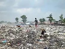 Among the most common types of job-related injuries for waste pickers are back and hand injuries caused by lifting heavy objects with little equipment.[28] In a study of 48 waste pickers in Santo André, Brazil, almost all workers reported pain in the back, legs, shoulder, arms, and hands.[29] Waste pickers who work in open dumps are exposed to large amounts of toxic fumes, and face other severe threats including being run over by trucks and caught in surface subsidence, trash slides, and fires.[24] On 10 July 2000, several hundred waste pickers were killed by a trash slide from a huge garbage mountain after monsoon rains at an open dump in Payatas, Philippines.[30][31][32]