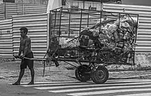 The rapid urbanization greatly increased the demand for informal waste collecting services, as cities lacked the infrastructure and resources to collect the totality of wastes generated by their inhabitants. Despite spending 30–50% of operation budgets on waste management, developing world cities today collect only 50–80% of refuse generated by inhabitants. Residents and businesses often resort to burning garbage or disposing of it in streets, rivers, vacant lots, and open dumps.[15] This is a source of air, land, and water pollution that threatens human health and the environment. Informal waste collectors help mitigate this harm by collecting recyclable materials by foot or in pushcarts, tricycles, donkey carts, horse carts, and pickup trucks.[16]