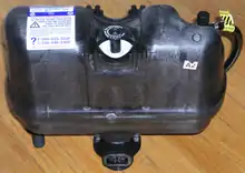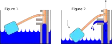 The mechanism consists of a plastic tank hidden inside the typical ceramic cistern or an exposed metal tank/cistern.[13] When the tank fills with water, the air trapped inside compresses. When the air pressure inside the plastic tank reaches a certain level, the tank stops filling with water. A high-pressure valve located in the center of the vessel holds the air and water inside until the user flushes the toilet.[14]
