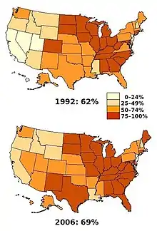 As of May 2000, 42 of the 50 largest U.S. cities had water fluoridation.[27] According to a 2002 study,[28] 67% of U.S. residents were living in communities with fluoridated water at that time.