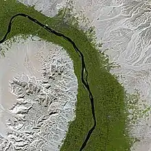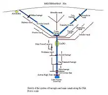 Irrigation canals are classified into principal canals (Rayah), main canals (first level canals), branch canals (second level canals), distribution canals (mesqas, or third level canals) and irrigation ditches (Merwas).[2] Flow in the principal and main canals is continuous; in the branch and distribution canals it is on a rotation basis. However, the government supports a process of converting some of the lower-level canals gradually to continuous flow. Farmers pump water from the mesqas to irrigate fields (lift: about 0.5–1.5 m).[3] A mesqa typically serves an area of 50 to 200 feddan (20 to 80 hectares).[2] In areas where there is no formal operational structure for proper water distribution, the tail-end users usually are not getting enough water to maintain crops.[4] Water user associations have been formed beginning in the 1990s to better distribute water among farmers on a mesqa and to rationalize pumping, with the aim of reducing water abstraction, pumping costs and to increase yields.