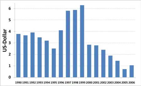 According to the Controlaría General de la República, US$203 million were invested in water supply and sanitation from 1990 to 2006, which is on average US$3.3 per capita and year. The investment reached its peak in 1999, when it was US$6.3 per capita. Since 2000, it fell back substantially until reaching only US$0.7 in 2005 and US$1.1 in 2006. Compared to other Latin American countries, this investment level is very low.[12]