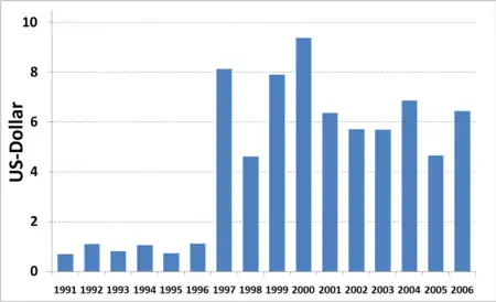 According to the Nicaraguan Unidad Pública de Inversiones or Public Investment Unit, investments in water and sanitation from 1991-2006 were US$351 million or on average USD 22 million per year. This corresponds to 0.49% of GDP or US$4.5/capita/year. Within that period investment levels increased substantially in 1997. After ranging between US$0.7 and US$1.1 per capita from 1991 to 1996, it went up to US$4.7 to US$9.4 from 1997 to 2006.[27] All in all, the average investment level per capita and year from 1997 to 2003 is higher than in its neighboring countries Costa Rica and Honduras, but lower than in South American countries like Argentina, Peru and Colombia.[28]