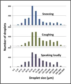 Wells' insight was widely adopted because of its relevance for the spread of respiratory infections.[5] The efficiency of transmission of specific viruses and bacteria depends both on the types of droplets and droplet nuclei they cause and on their ability to survive in droplets, droplet nuclei and fomites. Diseases such as measles, whose causative viruses remain highly infectious in droplet nuclei, can be spread without personal contact, across a room or through ventilation systems and are said to have airborne transmission.[4] Although later studies demonstrated that the droplet size at which evaporation outpaces falling is smaller than that described by Wells, and the settling time is longer, his work remains important for understanding the physics of respiratory droplets.[3]