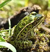 Amphibians such as frogs and salamanders need both terrestrial and aquatic habitats in which to reproduce and feed. Because amphibians often inhabit depressional wetlands like prairie potholes and Carolina bays, the connectivity among these isolated wetlands is an important control of regional populations.[51] While tadpoles feed on algae, adult frogs forage on insects. Frogs are sometimes used as an indicator of ecosystem health because their thin skin permits absorption of nutrients and toxins from the surrounding environment resulting in increased extinction rates in unfavorable and polluted environmental conditions.[52]