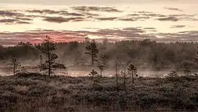 Wetlands can be tidal (inundated by tides) or non-tidal.[22] The water in wetlands is either freshwater, brackish, saline, or alkaline.[2] There are four main kinds of wetlands – marsh, swamp, bog, and fen (bogs and fens being types of peatlands or mires). Some experts also recognize wet meadows and aquatic ecosystems as additional wetland types.[1] Sub-types include mangrove forests, carrs, pocosins, floodplains,[1] peatlands, vernal pools, sinks, and many others.[23]