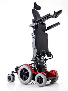 A standing wheelchair is one that supports the user in a nearly standing position. They can be used as both a wheelchair and a standing frame, allowing the user to sit or stand in the wheelchair as they wish. Some versions are entirely manual, others have a powered stand on an otherwise manual chair, while others have full power, tilt, recline and variations of powered stand functions available. The benefits of such a device include, but are not limited to: aiding independence and productivity, raising self-esteem and psychological well-being, heightening social status, extending access, relief of pressure, reduction of pressure sores, improved functional reach, improved respiration, reduced occurrence of UTI, improved flexibility, help in maintaining bone mineral density, improved passive range motion, reduction in abnormal muscle tone and spasticity, and skeletal deformities. Other wheelchairs provide some of the same benefits by raising the entire seat to lift the user to standing height.