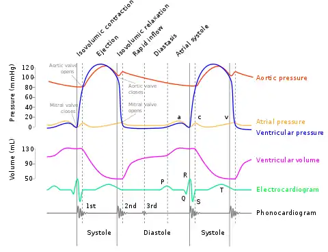 A Wiggers diagram, named after its developer, Carl Wiggers, is a unique diagram that has been used in teaching cardiac physiology for more than a century.[1][2] In the Wiggers diagram, the X-axis is used to plot time subdivided into the cardiac phases, while the Y-axis typically contains the following on a single grid: