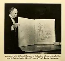 Osler was a prolific author and a great collector of books and other material relevant to the history of medicine. He willed his library to the Faculty of Medicine of McGill University where it now forms the nucleus of McGill University's Osler Library of the History of Medicine.[26] Osler was a strong supporter of libraries and served on the library committees at most of the universities at which he taught and was a member of the Board of Curators of the Bodleian Library in Oxford. He was instrumental in founding the Medical Library Association in North America, alongside employee and mentee Marcia Croker Noyes,[27] and served as its second president from 1901 to 1904. In Britain he was the first (and only) president of the Medical Library Association of Great Britain and Ireland[28] and also a president of the Bibliographical Society of London (1913).[29]