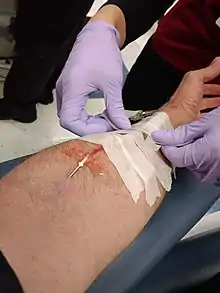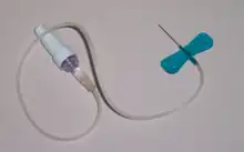 A winged infusion set—also known as "butterfly" or "scalp vein" set—is a device specialized for venipuncture: i.e. for accessing a superficial vein or artery for either intravenous injection or phlebotomy. It consists, from front to rear, of a hypodermic needle, two bilateral flexible "wings", flexible small-bore transparent tubing (often 20–35 cm long), and lastly a connector (often female Luer). This connector attaches to another device: e.g. syringe, vacuum tube holder/hub, or extension tubing from an infusion pump or gravity-fed infusion/transfusion bag/bottle.